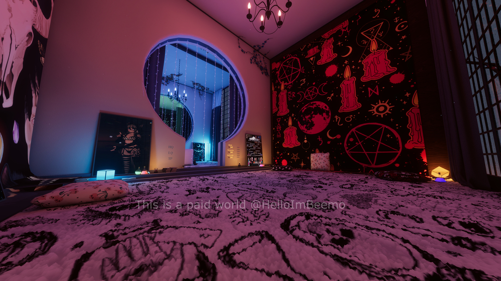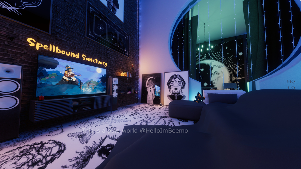 Spellbound Sanctuary is a witchy/spooky aesthetic world set in a rainstorm with lightning! Come relax, play games with friends, or watch the rain come down from multiple windows!